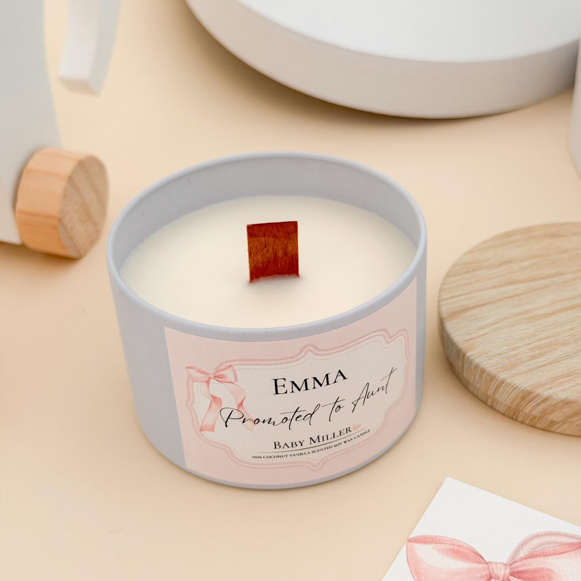 Surprise your sister with the sweetest pregnancy announcement! This elegant “Promoted to Aunt” gift box includes a beautifully crafted soy wax candle that can be personalized with her name and your baby’s name or due date. Perfect for announcing your pregnancy in a warm and meaningful way.