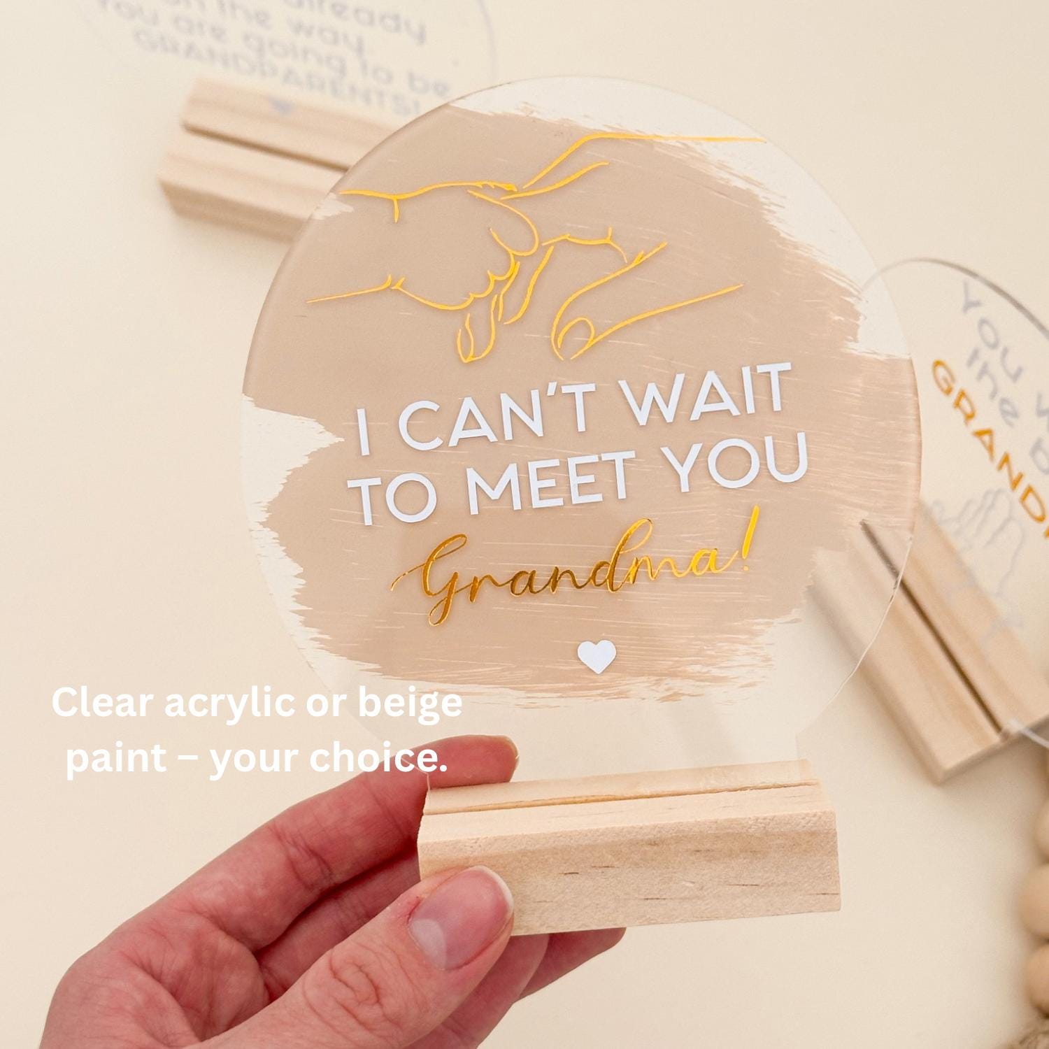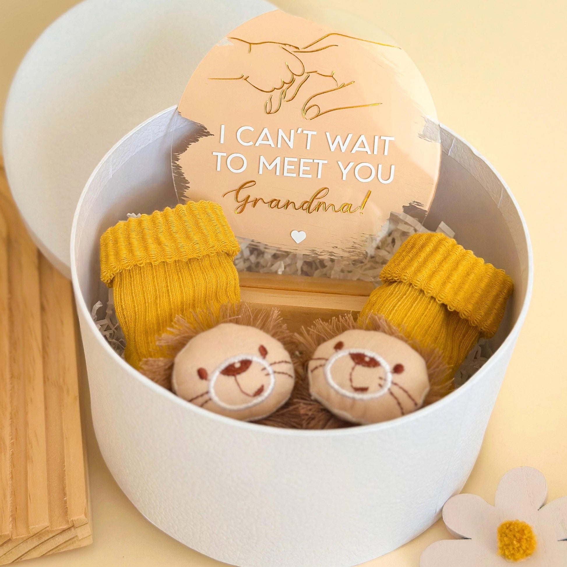 Make your pregnancy announcement extra special with this elegant acrylic sign, and cute baby bear socks the perfect way to surprise future grandparents! The sign features a heartwarming message, and you can choose from different text options or request a fully personalized engraving on the acrylic plaque or gift box. Thoughtfully designed, this keepsake makes a meaningful and lasting memory for grandma and grandpa. A beautiful addition to baby reveal celebrations, family gatherings, or as a heartfelt surprise gift.